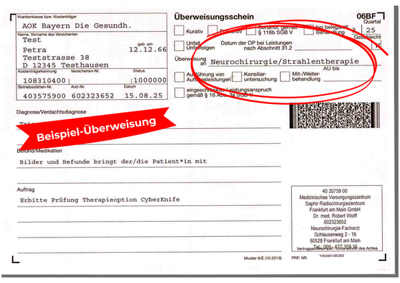 - Überweisung für die Neurochirurgie oder Strahlentherapie (siehe Beispiel-Überweisung)